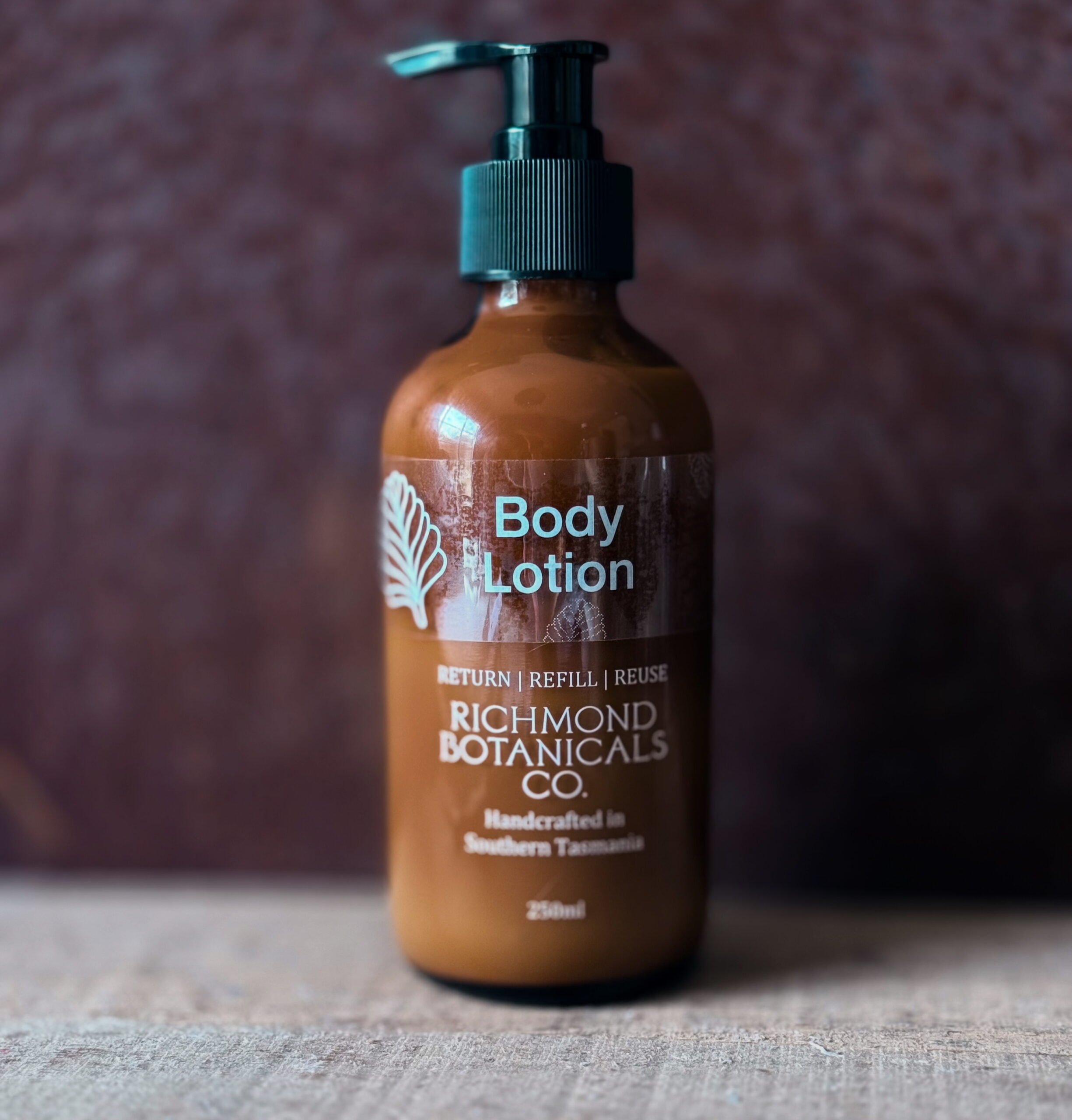 Enriched with a blend of Tasmanian botanicals, our body lotion features Hemp Seed Oil, Blue Gum Extract, and Oat Milk to calm and care for your skin. Infused with Macadamia Nut Oil and Olive Squalane, this plant-based formula delivers deep hydration and lasting nourishment. Lightly scented with Rose Geranium essential oil, it leaves your skin feeling soft, supple, and beautifully refreshed.